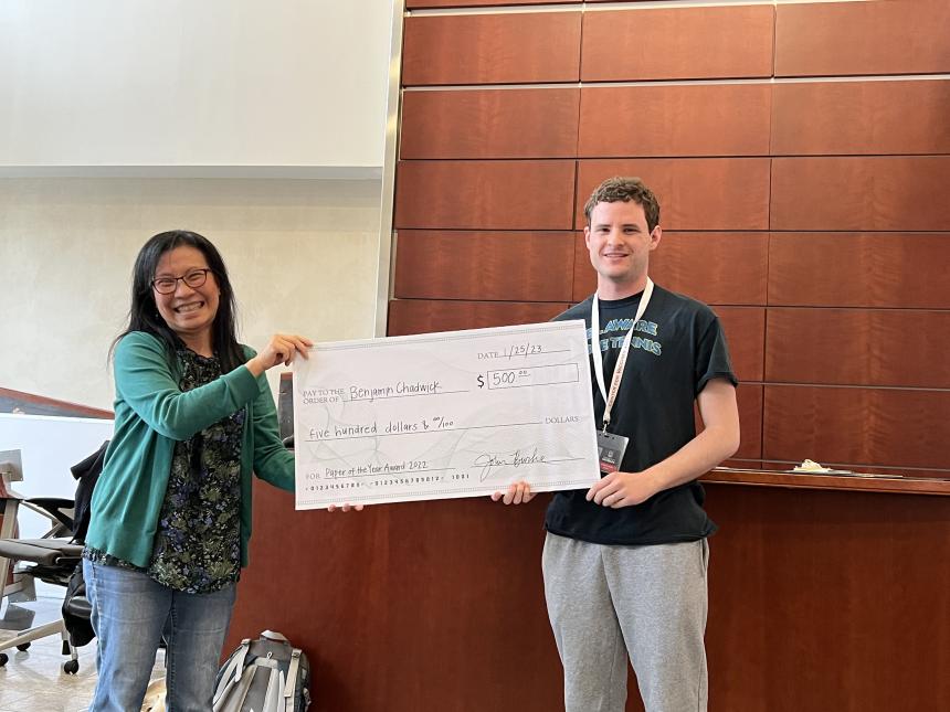 Image: Congratulations to Benjamin Chadwick, Ph.D. candidate in the Lin Lab, for winning the department’s Graduate student Paper-of-the Year award for 2022. Benjamin’s paper “The RAM signaling pathway links morphology, thermotolerance, and CO2 tolerance in the global fungal pathogen Cryptococcus neoformans” identified two genes related to CO2 tolerance in the fungus C. neoformans. C. neoformans kills over 180,000 people every year. It targets the lungs and the central nervous system affecting primarily people with weakened immune systems. The fungus can withstand high CO2 environments in the human body (5-10%) and has a high heat tolerance, which allows it to thrive in its human host. Chadwick et al. (2022) investigated the RAM pathway of the fungus which is activated by heat stress. They compared genomic sequences of fungus strains with high CO2 tolerance to those with low CO2 tolerance and found two mutations in the low CO2 strains. They verified their results by deleting the genes with these mutations, which restored the CO2 tolerance in these strains. This research provides significant insights on how the fungus survives in the human host. As noted by the editors: “These results should be of interest to a broad community in the life sciences including microbiologists and infectious diseases investigators”. Read the full paper here. An honorable mention for the 2022 Graduate Student Paper-of-the Year Award went to Ashley Earley and her paper “Genomic regions associate with major axes of variation driven by gas exchange and leaf construction traits in cultivated sunflower (Helianthus annuus L.).” Earley et al. (2022) studied leaf traits in cultivated sunflowers (Helianthus annuus L.) that are thought to play a key role in the adaptation of plants to drought. They were specifically interested in leaf anatomical traits like stomata and leaf veins which play an essential role in water loss and movement of water though leaves. The authors used patterns of variation and covariation in these leaf anatomical traits and analyzed their genetic architecture via genome-wide association (GWA) analyses, and identified specific genetic regions associated with stoma size and the density of leaf venation. This information can potentially be used to target specific leaf anatomical characteristics through breeding, producing sunflowers with increased drought resistance. Read the full article here.
