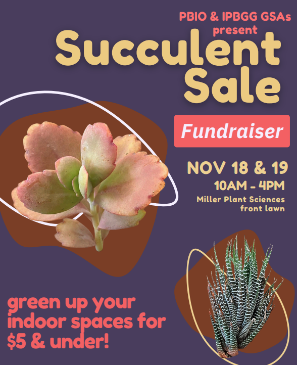 Image: Please stop by the succulent sale on Tuesday (11/18) and Wednesday (11/19) from 10am-4pm outside of Miller Plant Sciences to help support our graduate students! The Plant Biology Graduate Student Organization (PBGSA) is cohosting the succulent sale with the Graduate Students from the Institute of Plant Breeding, Genetics and Genomics (IPBGG GSA). They will have a large variety of succulents in small ($3) and medium ($5) pots that would be perfect for greening up your indoor spaces at home and in the office. All proceeds will be evenly split between the two GSAs. Thanks for your support, and we hope to see you there!