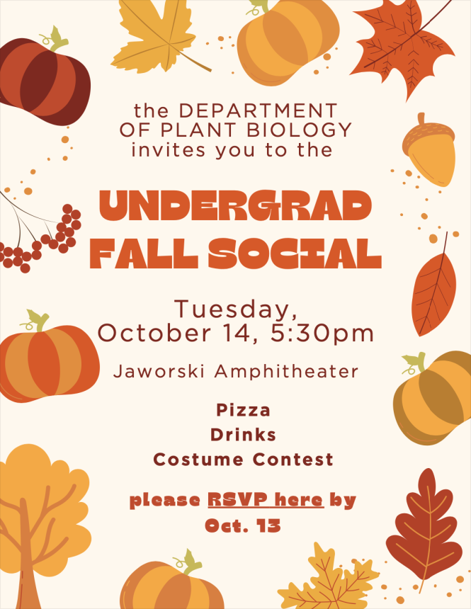Image: Please join us tomorrow for our departmental Undergraduate Fall Social, Oct 14 at 5:30 p.m. in the Jaworski Amphitheatre. We will have a costume contest, pizza, and refreshments. Please RSVP by the end of today, October 13th, at this link https://docs.google.com/forms/d/e/1FAIpQLSc3szjDaAyiUjZ0DKirkQofV8_meIzypX8R50sMT5S7xjBwxA/viewform